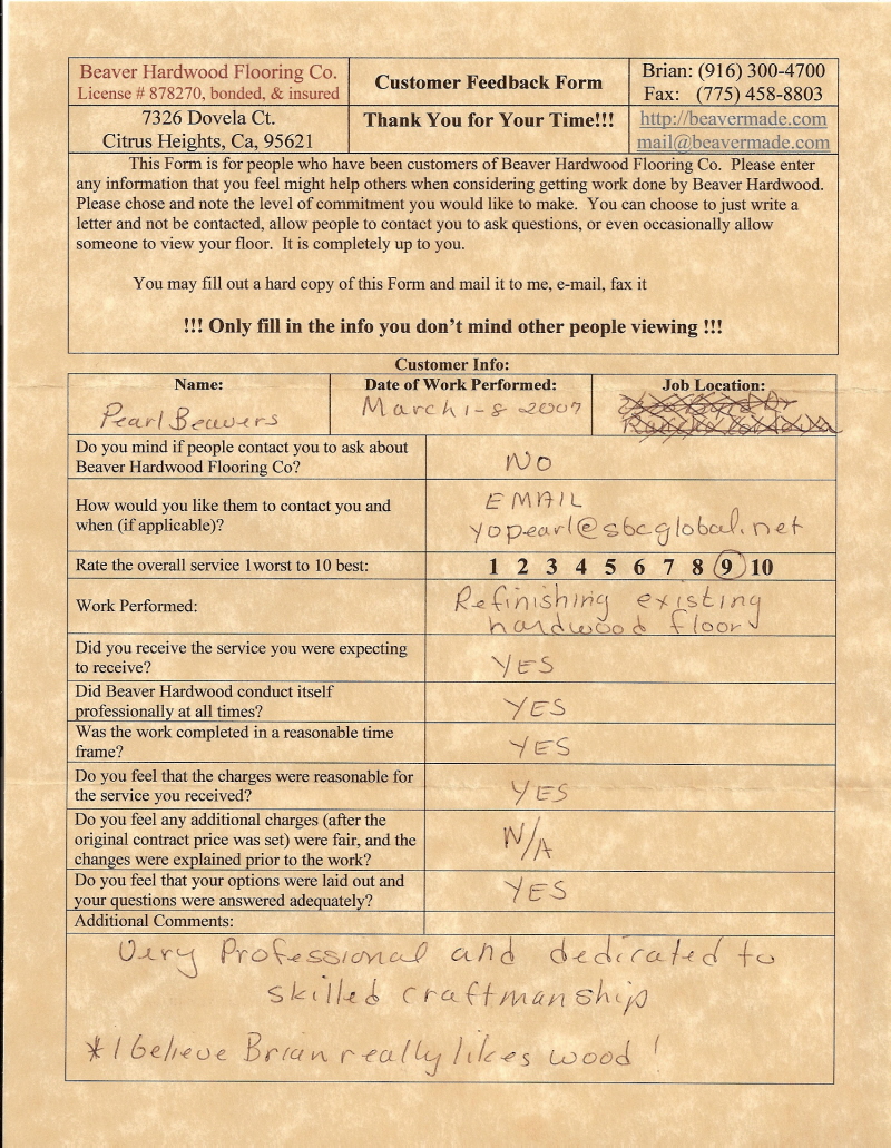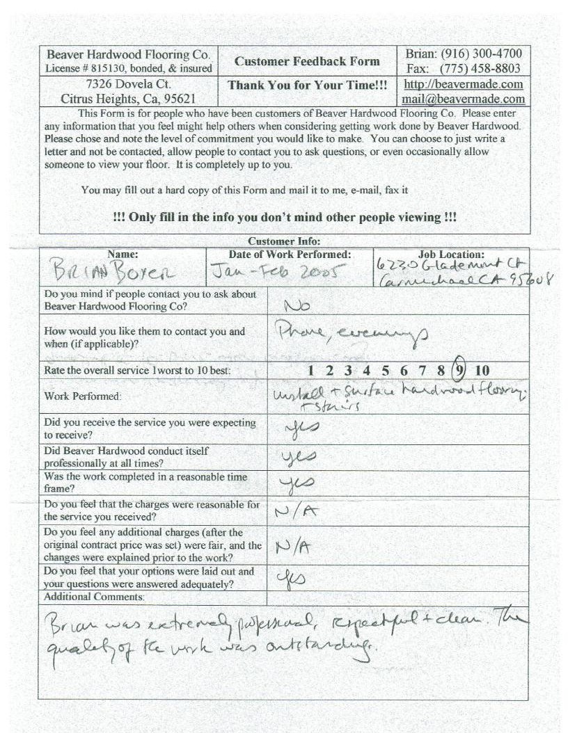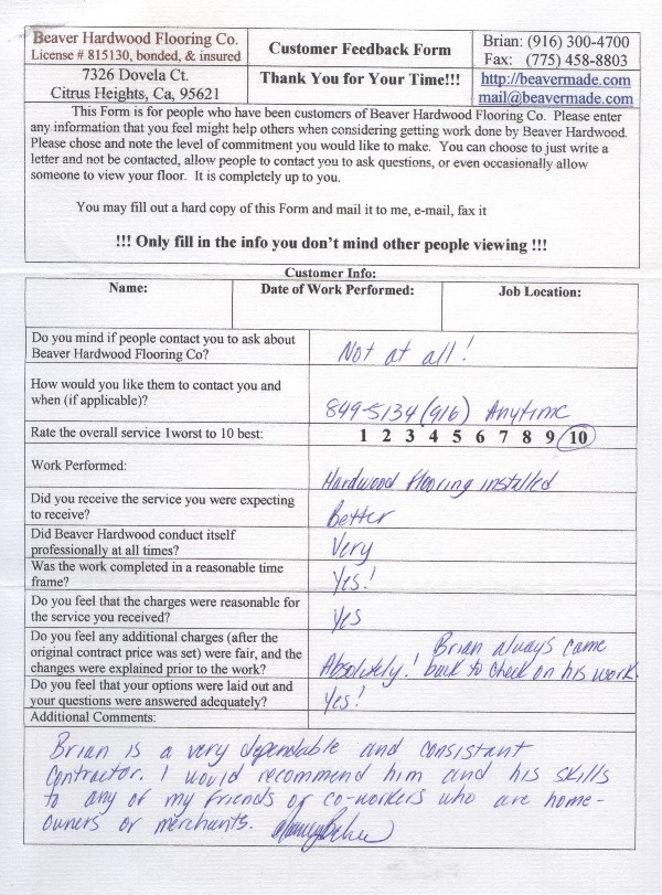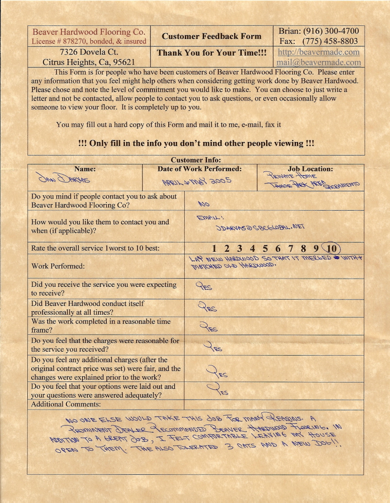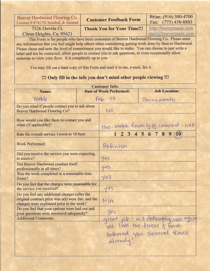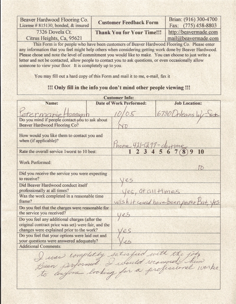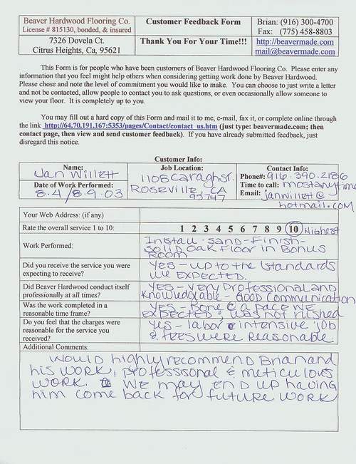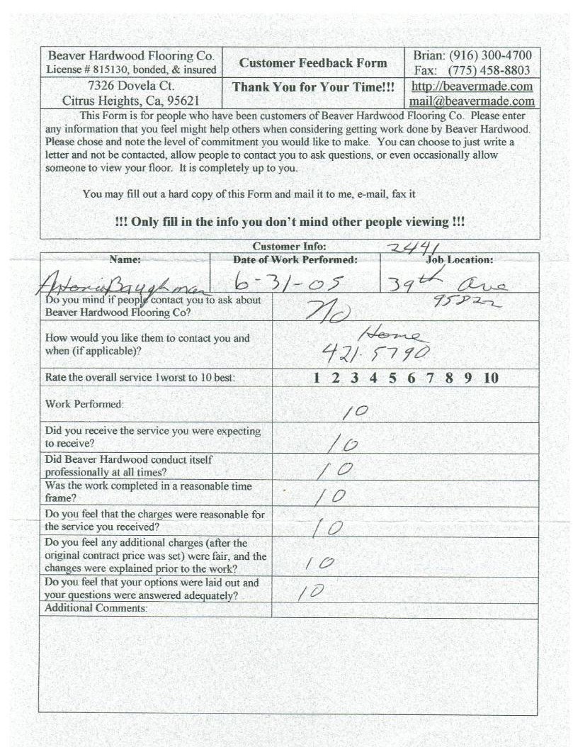 Hardwood flooring company in Sacramento / Placer, California (owned and operated by Brian Beaver);  We travel to surrounding areas. We can answer all of yimageour hardwood flooring questions due to over a decade of experience with all wood and laminate flooring types.  We specialize in on-site sand and finished floors with boarders, inlays,and custom designs, gym and basketball floors, and finishing. We have a California based flooring license (c15).  References are available and all estimates are free!  Call (916)300-4700 or email us (please put 'flooring' in the subject line) for a free estimate.