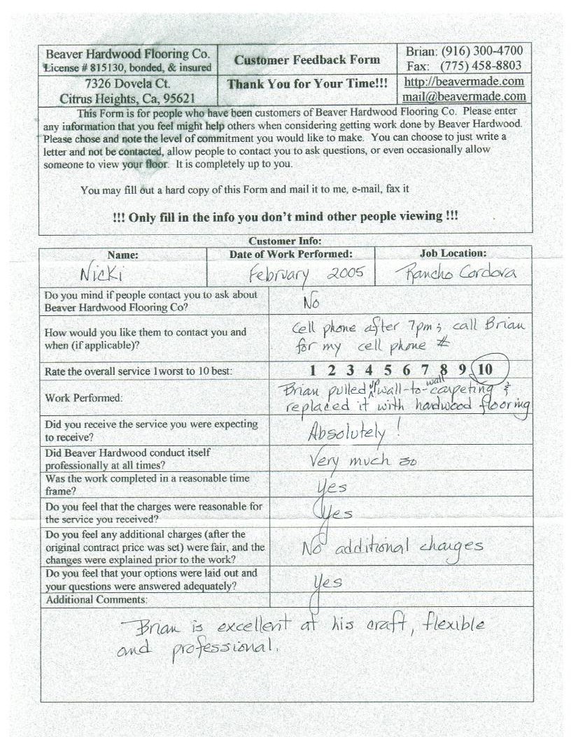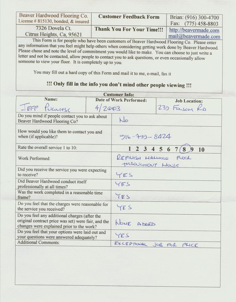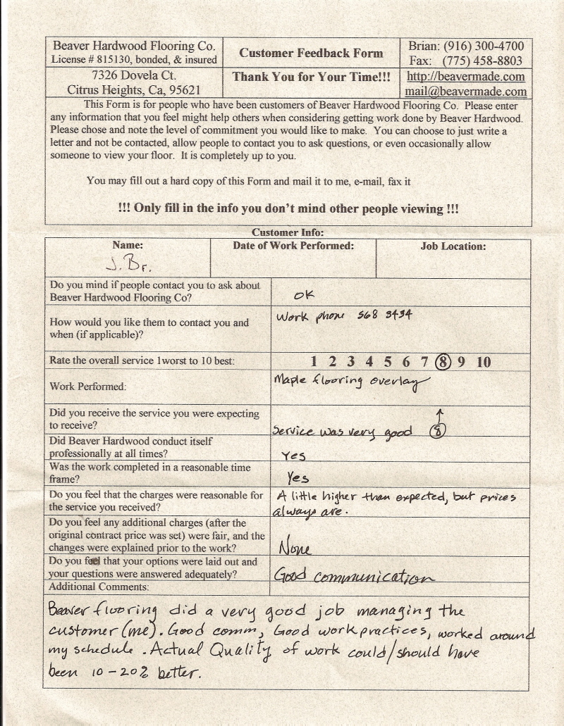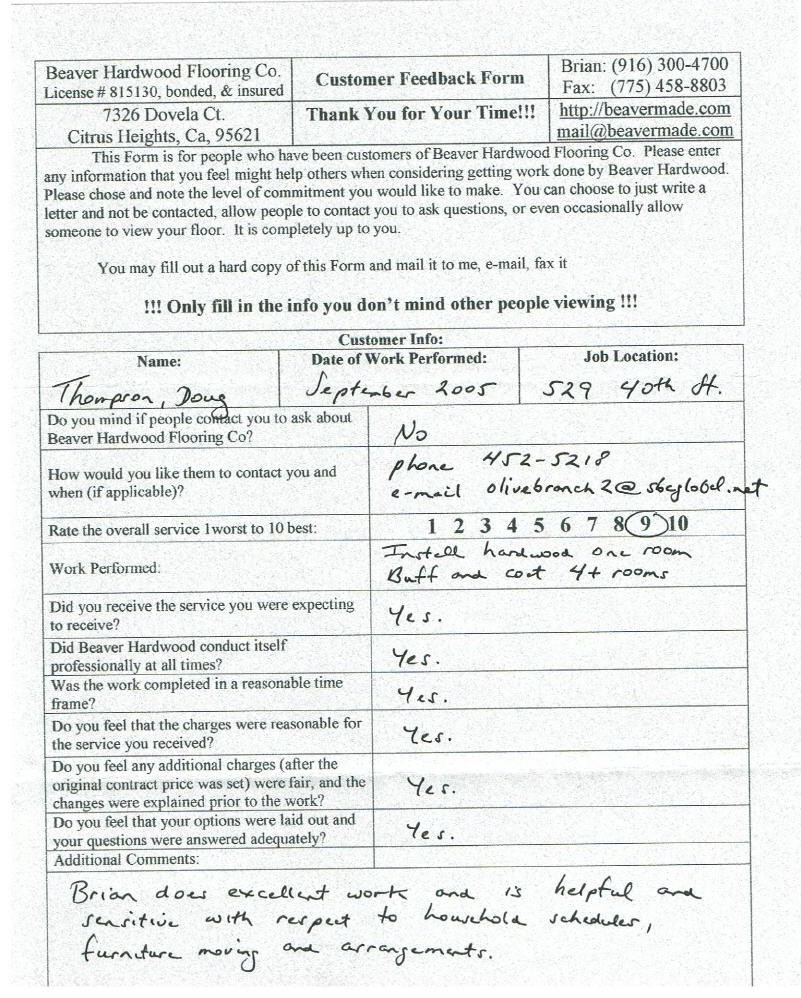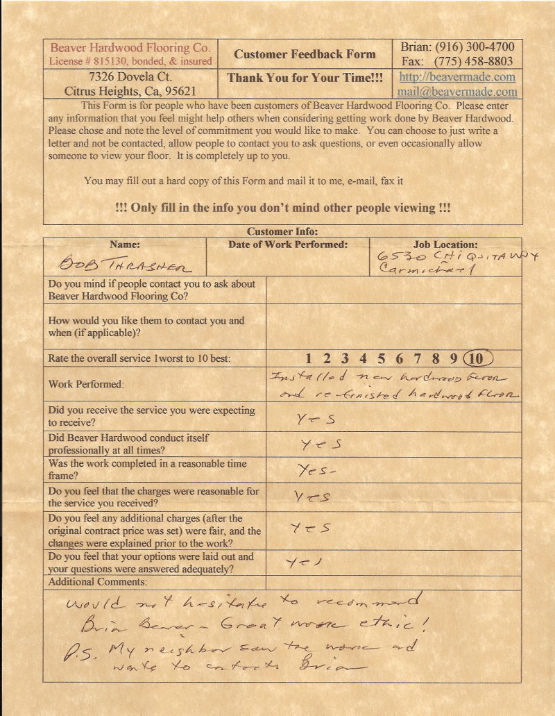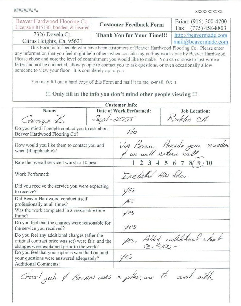 Hardwood flooring company in Sacramento / Placer, California (owned and operated by Brian Beaver);  We travel to surrounding areas. We can answer all of yimageour hardwood flooring questions due to over a decade of experience with all wood and laminate flooring types.  We specialize in on-site sand and finished floors with boarders, inlays,and custom designs, gym and basketball floors, and finishing. We have a California based flooring license (c15).  References are available and all estimates are free!  Call (916)300-4700 or email us (please put 'flooring' in the subject line) for a free estimate.