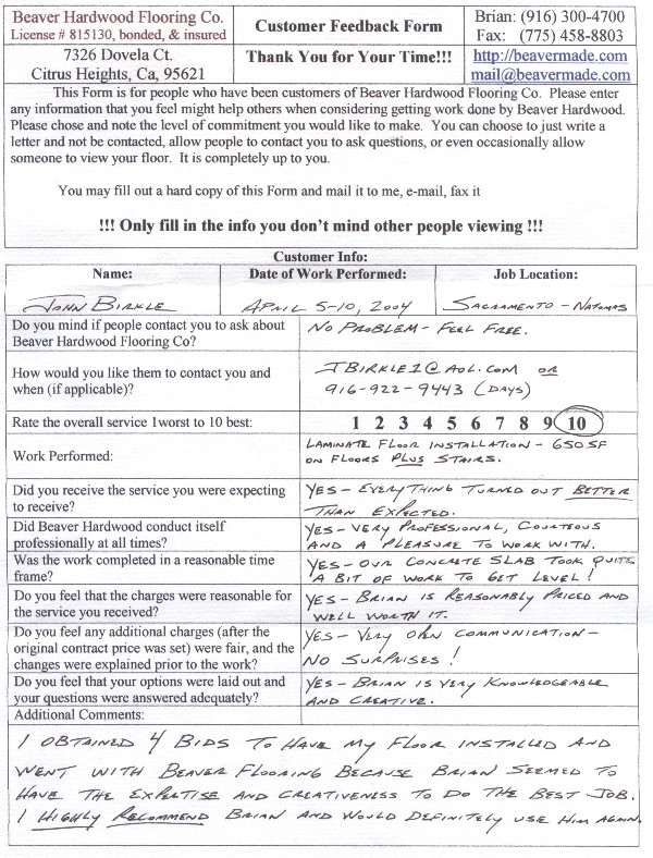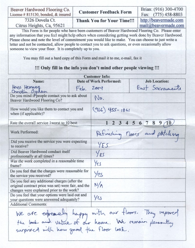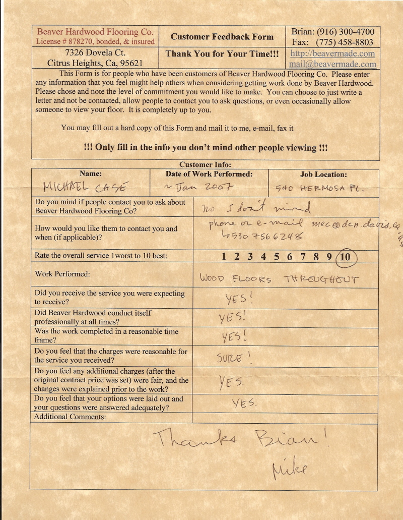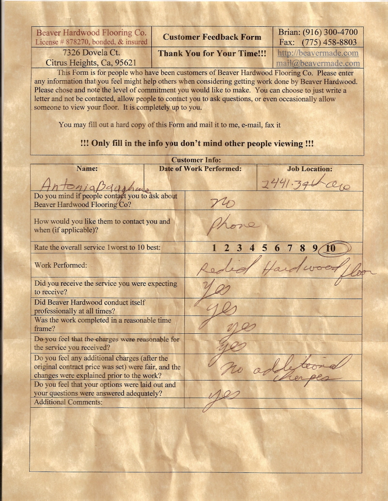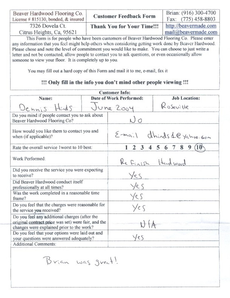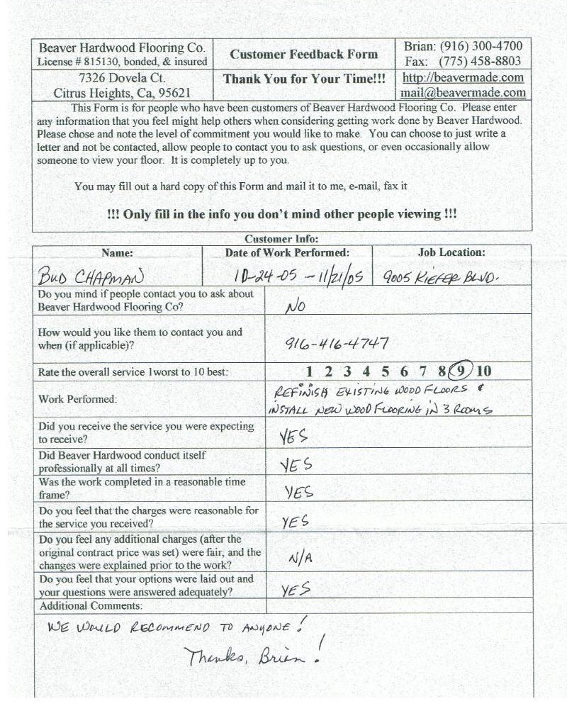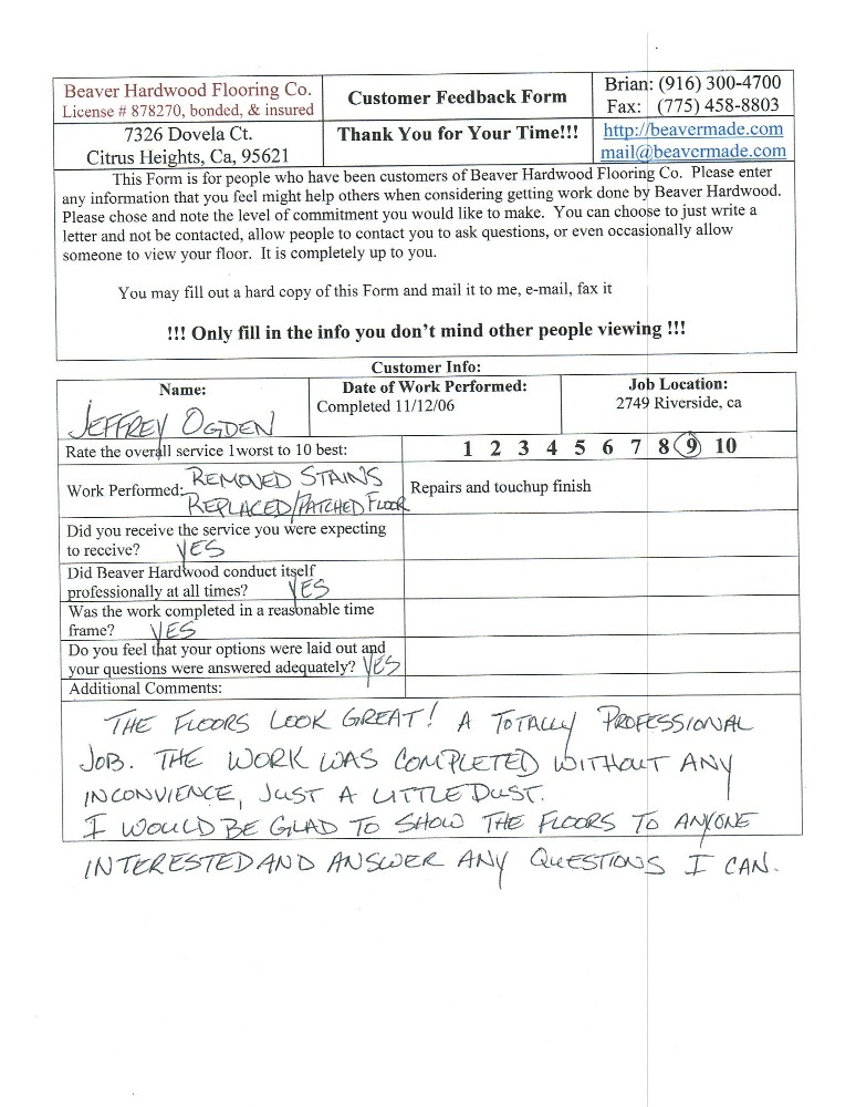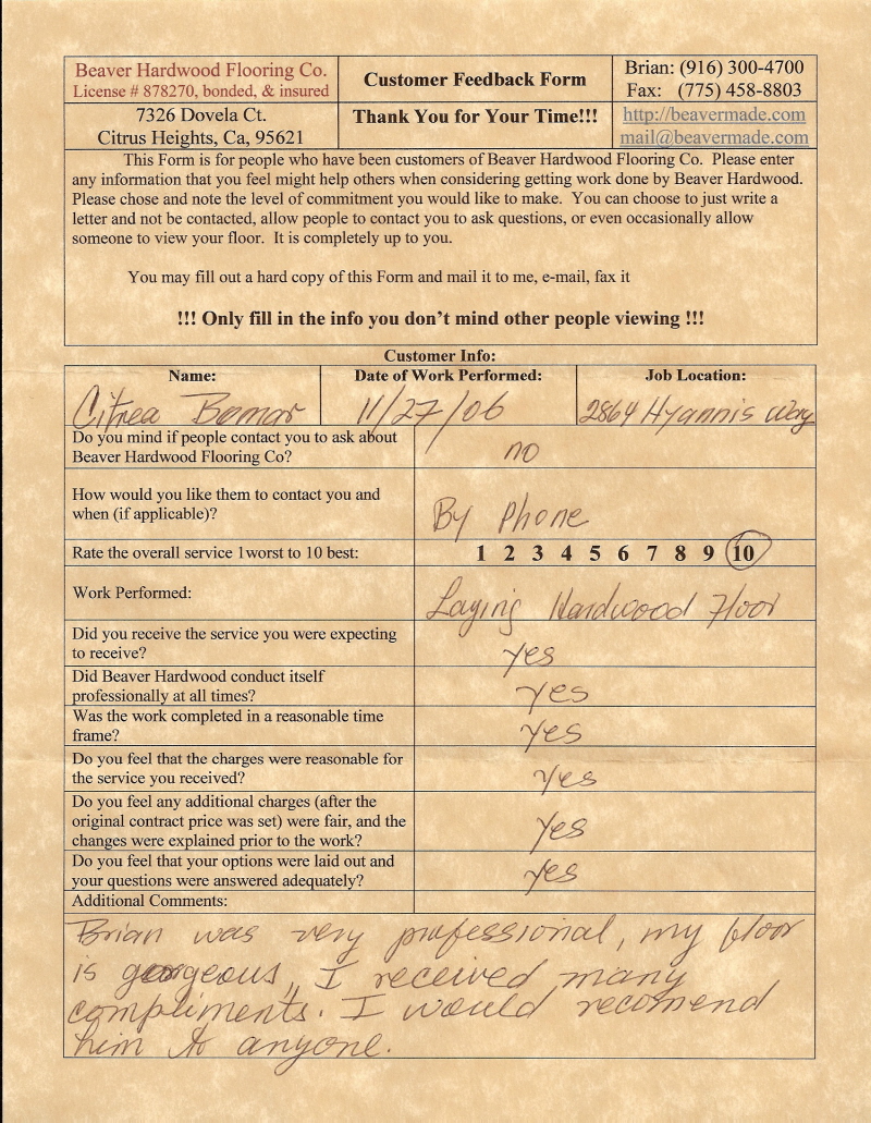 Hardwood flooring company in Sacramento / Placer, California (owned and operated by Brian Beaver);  We travel to surrounding areas. We can answer all of yimageour hardwood flooring questions due to over a decade of experience with all wood and laminate flooring types.  We specialize in on-site sand and finished floors with boarders, inlays,and custom designs, gym and basketball floors, and finishing. We have a California based flooring license (c15).  References are available and all estimates are free!  Call (916)300-4700 or email us (please put 'flooring' in the subject line) for a free estimate.